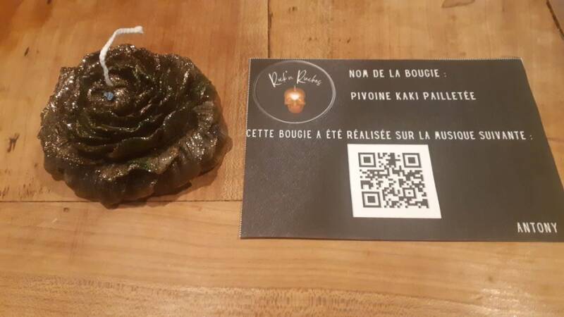 Présentation finale des produits commandés, la bougie + un goodies choisi au hasard + une fiche récapitulative avec le nom de votre bougie et la musique qui a inspiré sa création.