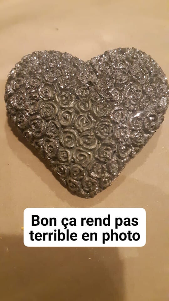 Arbre de vie et pivoine aspect moiré et dégradé de couleur (qui ne se voit pas voir la photo). Coueur noir pailleté argent (qui ne se voit pas non plus...)